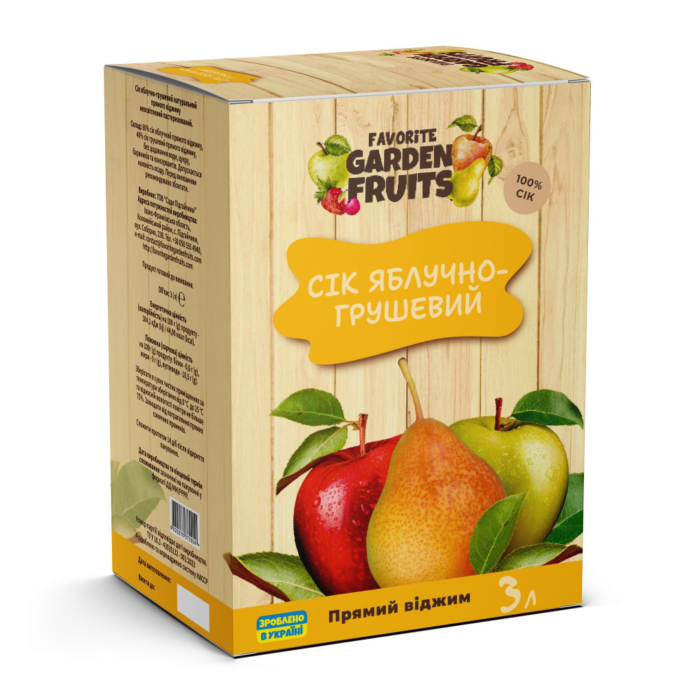 Склад: 60% сік яблучний прямого віджиму, 40% сік грушевий прямого віджиму